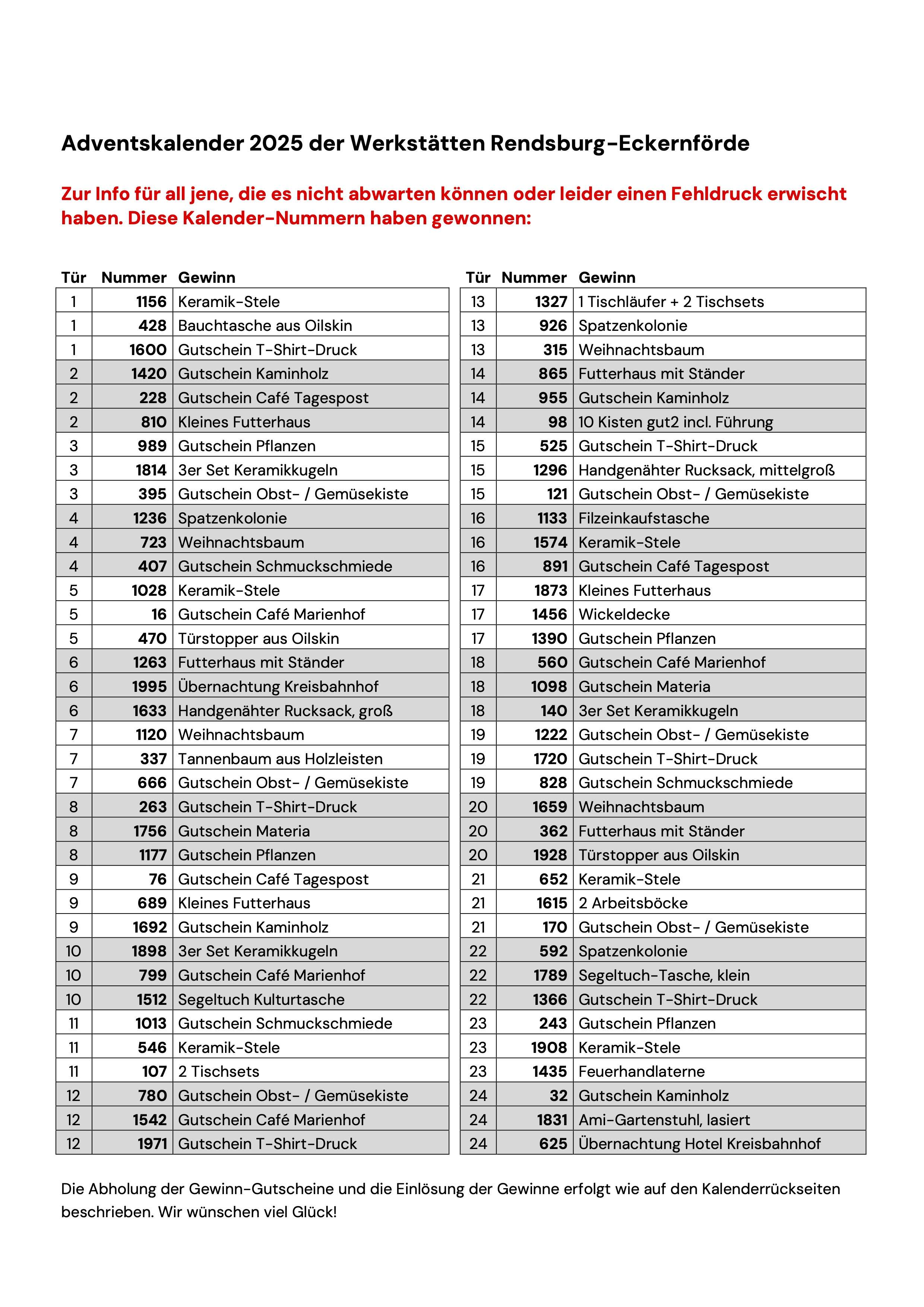 Leider haben wir gerade erfahren, dass einige Fehldrucke im Umlauf sind, auf denen hinter den Türchen keine Gewinn-Nummern abgedruckt sind.